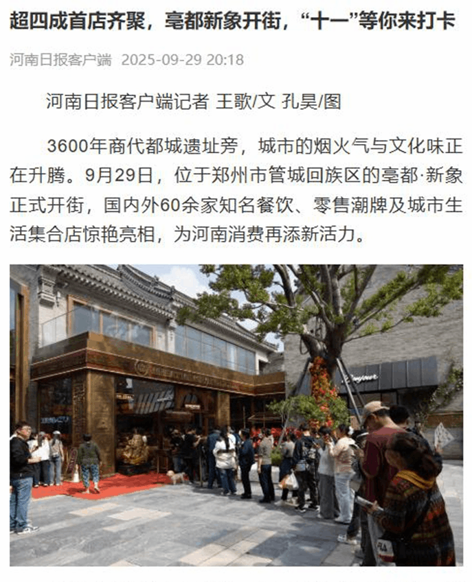 “亳都·新象”項(xiàng)目以“傳統(tǒng)風(fēng)貌現(xiàn)代文化商業(yè)街區(qū)”為定位,深度融合3600年商都文脈與現(xiàn)代商業(yè)活力,通過40%的首進(jìn)品牌占比和精心策劃的文商旅融合體驗(yàn),為鄭州打造彰顯商都魅力的“城市文化名片”與對(duì)外開放的“國(guó)際商都會(huì)客廳”。