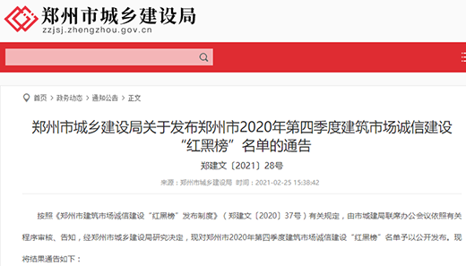 鄭州地產(chǎn)集團(tuán)投資管理有限公司 榮登鄭州市2020年第四季度 建筑市場(chǎng)誠(chéng)信建設(shè)“紅榜”