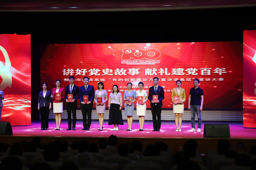 為慶祝中國(guó)共產(chǎn)黨成立100周年, 扎實(shí)開展黨史學(xué)習(xí)教育, 5月26日上午,鄭州市國(guó)資系統(tǒng)“講好黨史故事·獻(xiàn)禮建黨百年”——“黨的創(chuàng)新理論萬場(chǎng)宣講進(jìn)基層”宣講大賽在市總工會(huì)一樓職工大禮堂圓滿落下帷幕。來自市國(guó)資系統(tǒng)14家單位選送的15個(gè)宣講節(jié)目進(jìn)入大賽決賽,鄭州地產(chǎn)集團(tuán)選送的西流湖公司黨支部宣講節(jié)目《百年交響》榮獲三等獎(jiǎng)。