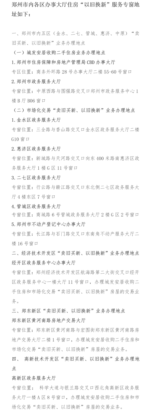 7月16日,記者從鄭州市房管局獲悉,為促進(jìn)該市房地產(chǎn)市場“賣舊買新、以舊換新”政策進(jìn)一步落實(shí),鄭州市房管局會同稅務(wù)、不動(dòng)產(chǎn)登記等部門,認(rèn)真梳理工作流程、全面開設(shè)服務(wù)專區(qū),全力推進(jìn)住房“以舊換新”工作。目前,鄭州市內(nèi)8區(qū)10個(gè)辦事大廳均開設(shè)“以舊換新”服務(wù)專窗,辦理相關(guān)業(yè)務(wù)可享受“專人專窗”的服務(wù)。