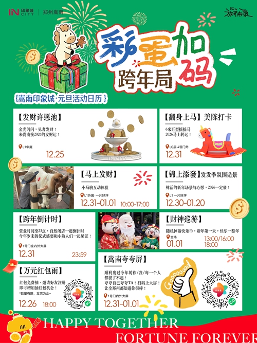 12月31日-1月3日,憑快樂幣可免費(fèi)騎小馬、抽獎(jiǎng)、兌換零食禮包,輕松實(shí)現(xiàn)童趣與味蕾雙重滿足??缒暌?,商場營業(yè)時(shí)間延長至23:00后自然閉店,大屏同步跨年倒計(jì)時(shí),和親友一起在歡呼聲中迎接2026,氛圍感直接拉滿!