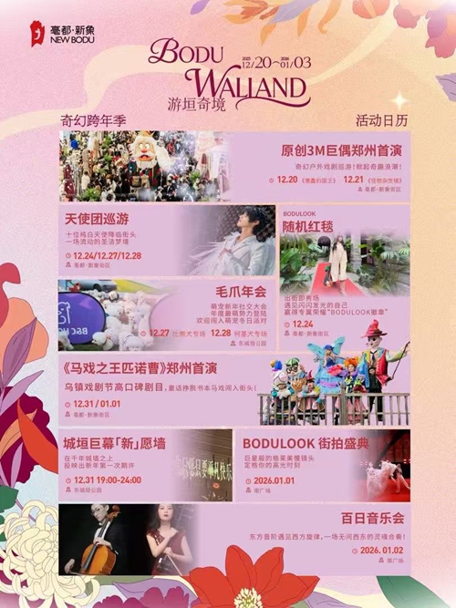 烏鎮(zhèn)戲劇節(jié)熱門劇目《馬戲之王匹諾曹》鄭州首演,帶你闖入夢幻童話世界;市民心愿將通過城垣巨幕“新”愿墻映上古老城墻,讓歷史見證美好憧憬;街拍盛典解鎖“巨星待遇”;格萊美級慢鏡頭定格高光瞬間;百日音樂會中西交融的旋律流淌街巷;竹藝美陳織就古今漫游動(dòng)線,邀全城市民共赴跨越時(shí)空的迎新之旅。